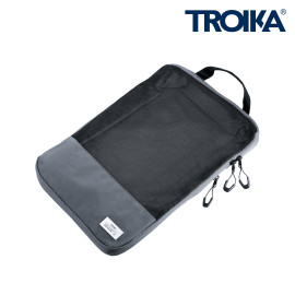 Expandable travel organizer for clothing, made of recycled marine plastic, size L, with main zippered opening and additional compression zip for space-saving, neat organization without creasing shirts, pants, etc. in suitcases and backpacks. Top part made of mesh, equipped with a handle...