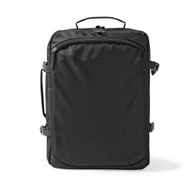 Nylon travel backpack. Features a 15" laptop compartment, a garment compartment with elastic straps, and a front zippered pocket. Side buckle closures. Trolley strap. 32L capacity...