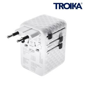 Travel adapter with integrated USB-C cable, compatible with all common power outlets worldwide, selectable contacts via sliding mechanism for region (EU/USA/AUS/CHN/UK), with additional socket for USA/JP, retractable 35W USB-C cable for fast charging (Power Delivery), 2 USB-A ports, 2 USB-C ports, to charge up to 6 electronic devices simultaneously..