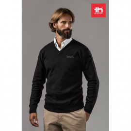 Мъжки пуловер с" V" деколте от 70% памук и 30% полиамид (220 г/м²). Има бие, маншети и долна част с ластик. Вталени ръкави. Размери: S, M, L, XL, XXL..