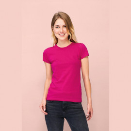 Дамска вталена тениска от 100% памучно трико(190 г/м²).Има тънка яка от трико с подсилена сатенена лента. С двоен шев на ръкавите и дъното. Размери: S, M, L, XL, XXL..